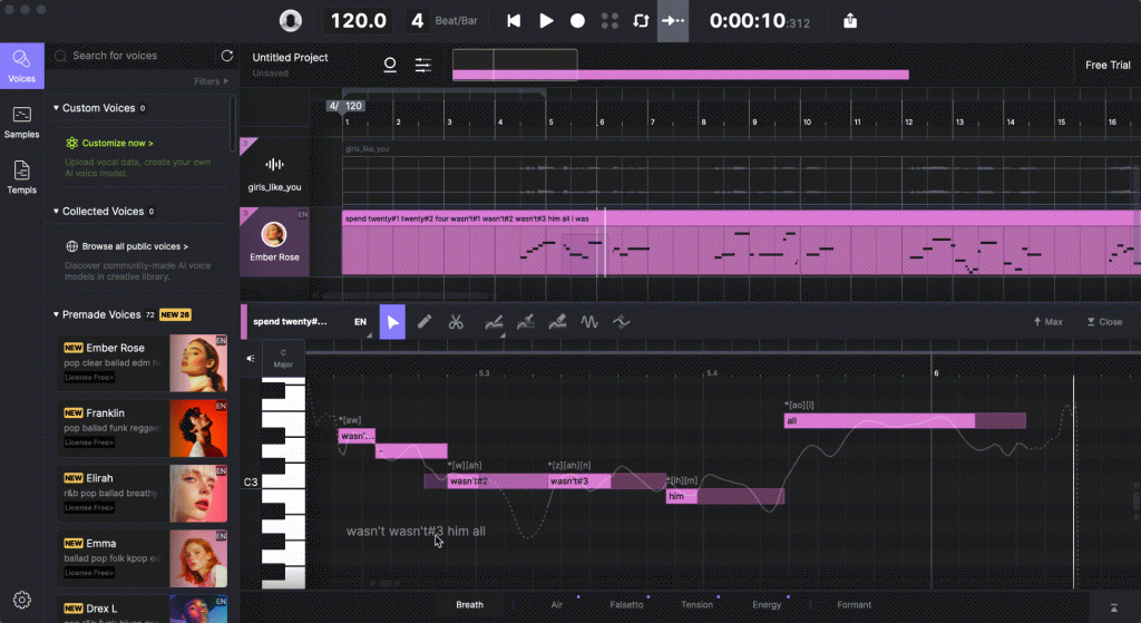 Its standout feature is the MIDI-to-Vocal system. With access to over 140 AI-trained voices and the option to train your own custom voice, you can map melodies directly using MIDI notation. Just draw or import your notes, select a voice, and generate a performance. As long as the guide is well considered, the results can sound impressively natural. From there, you can fine-tune expression, adjust vibrato, and even layer multiple voices to create rich harmonies or full choir effects.