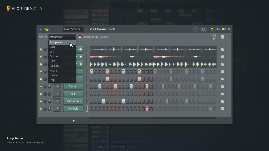 Once you select a genre from the drop-down menu in the Channel Rack, the sequencer will become populated with a pattern of MIDI-triggered loops and one-shots in that style. Hitting the dice icon will regenerate the samples on a per-track or global basis.
