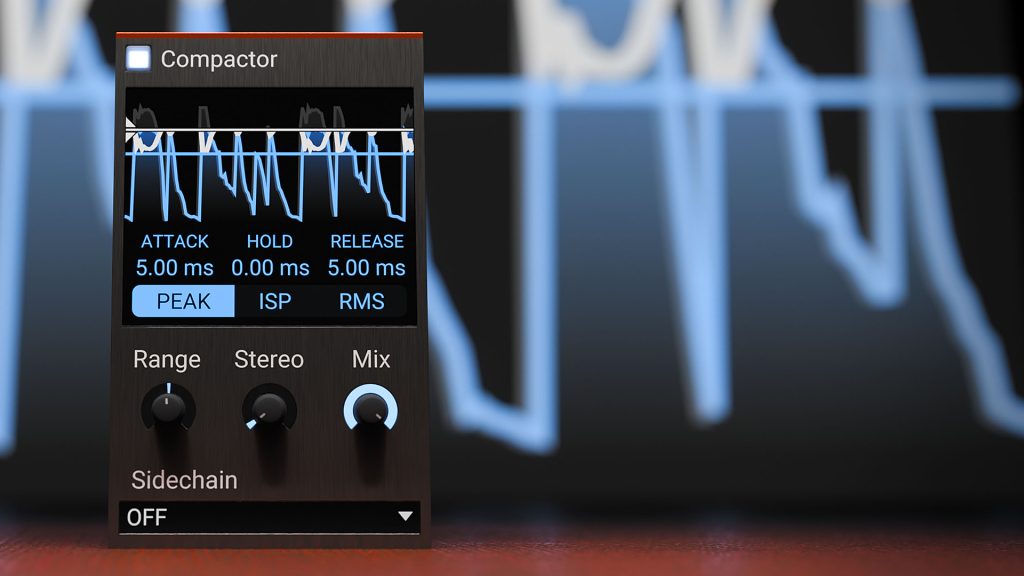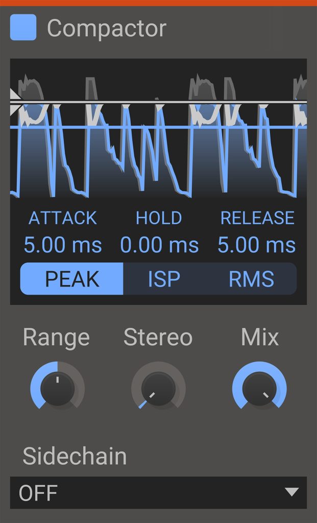 • With Sidechain: Route a source (like a kick) to the Compactor sidechain input, dial in Attack/Hold/Release/Threshold/Range – and voilà, transparent, tight mixing.